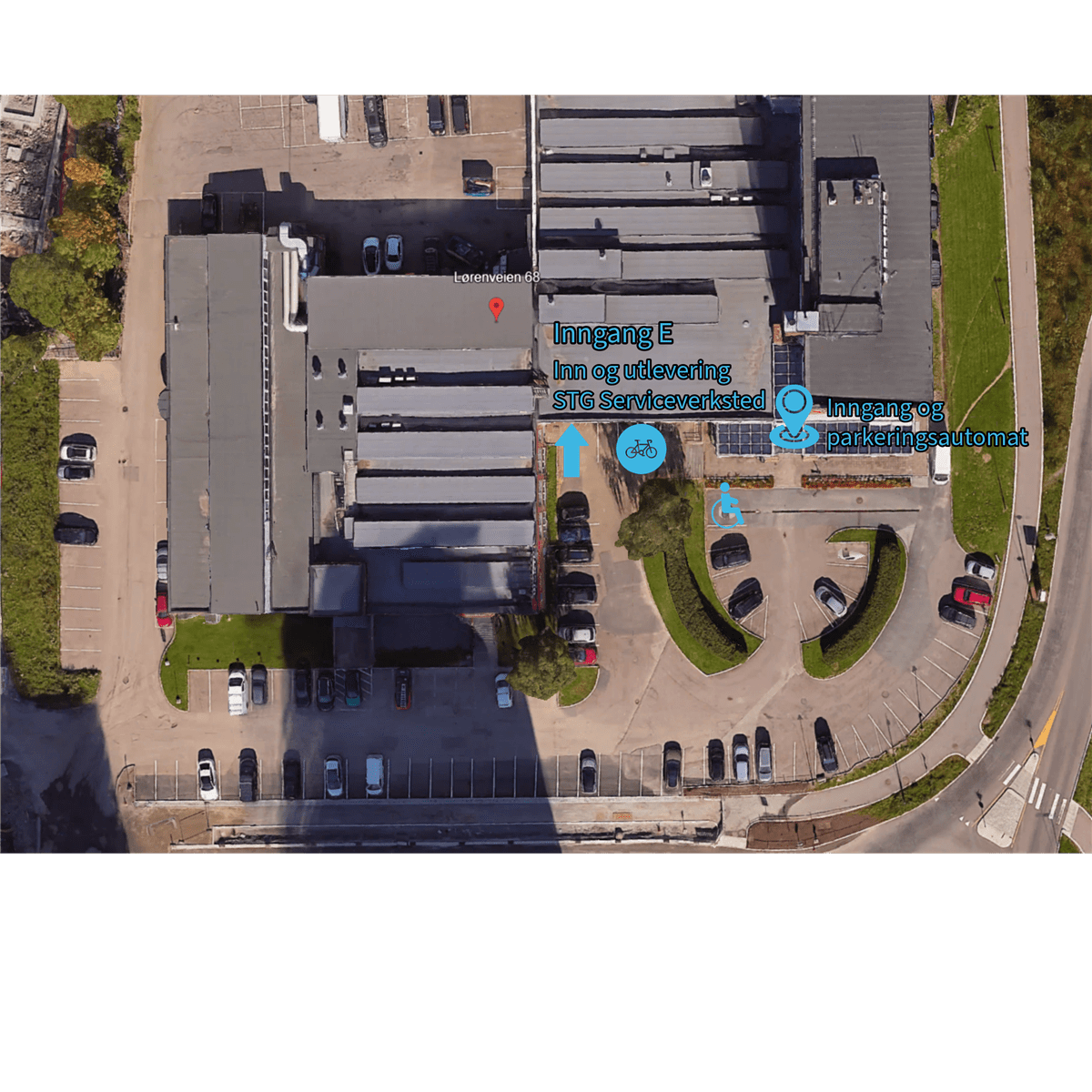 Lørenveien 68 ligger lett tilgjengelig med både bil og kollektivtransport. Se kart under eller bruk Google Maps for nøyaktig veibeskrivelse.