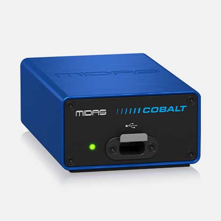 Midas COBALT er en kompakt, høyytelses HyperMAC‑til‑USB3‑konverter utviklet for krevende live‑ og installasjons oppgaver. Enheten gjør det mulig å ta opp og kjøre virtuell lydsjekk med opptil 192 kanaler via én sikker, låsbar USB‑C‑tilkobling direkte til en Mac.